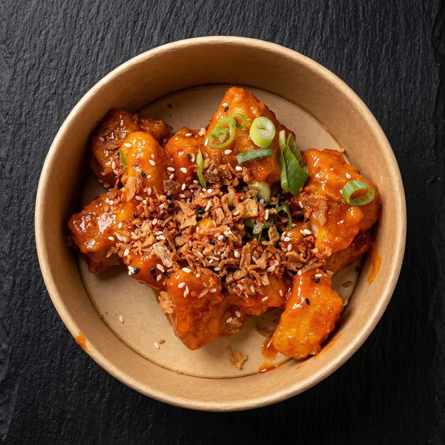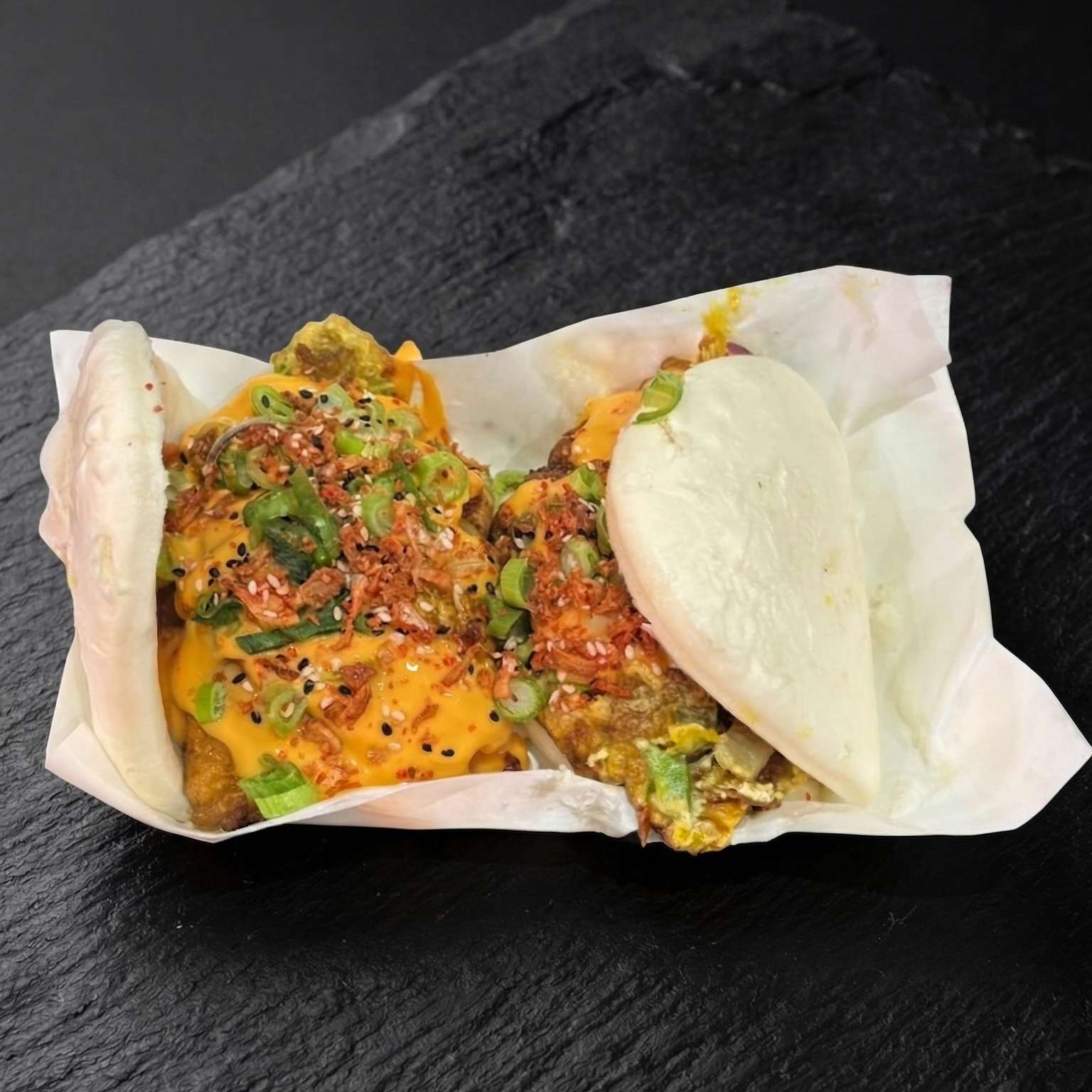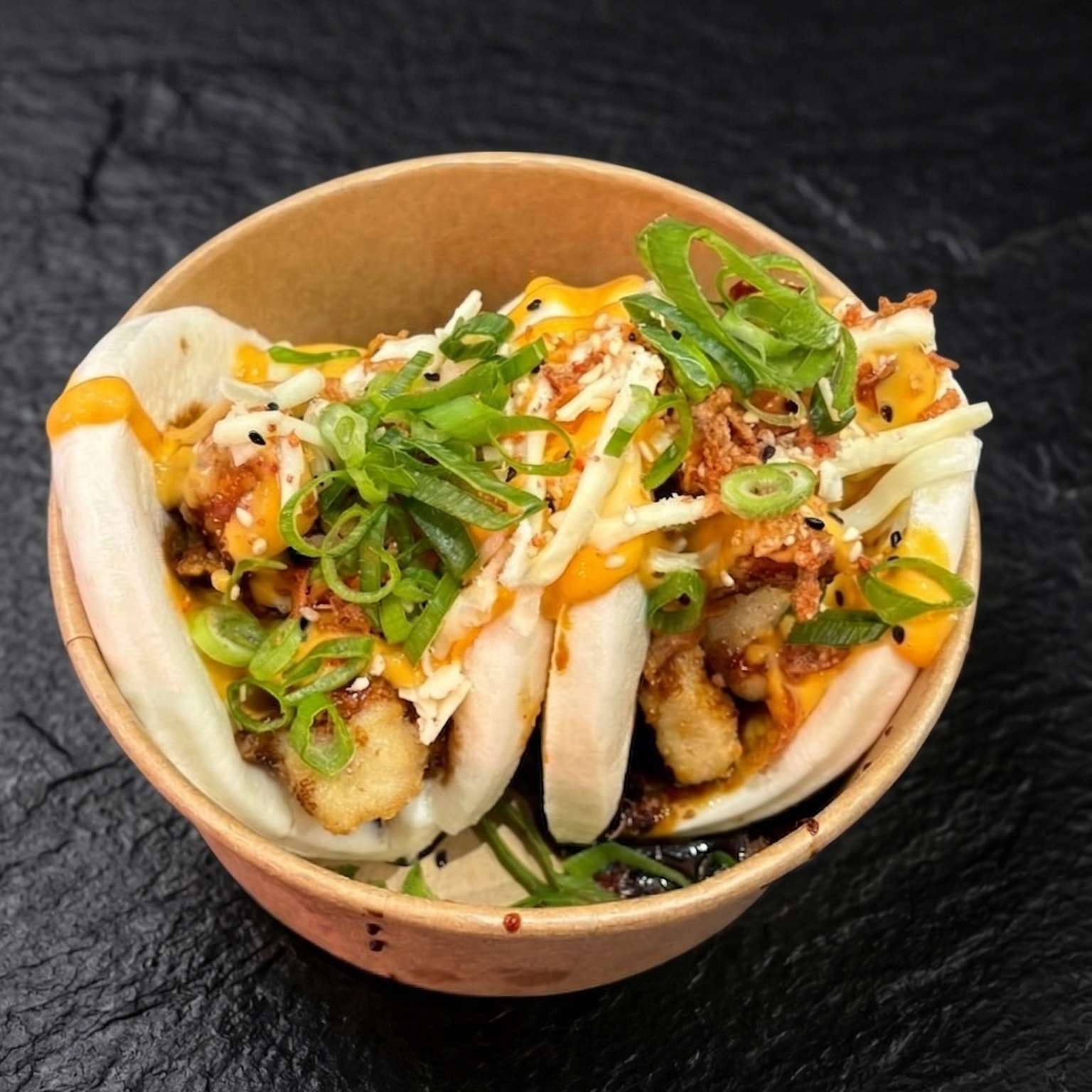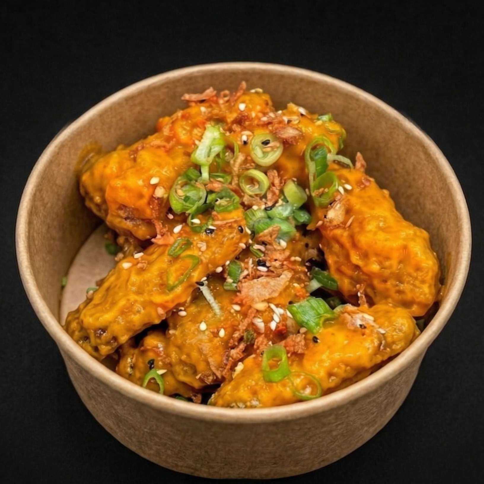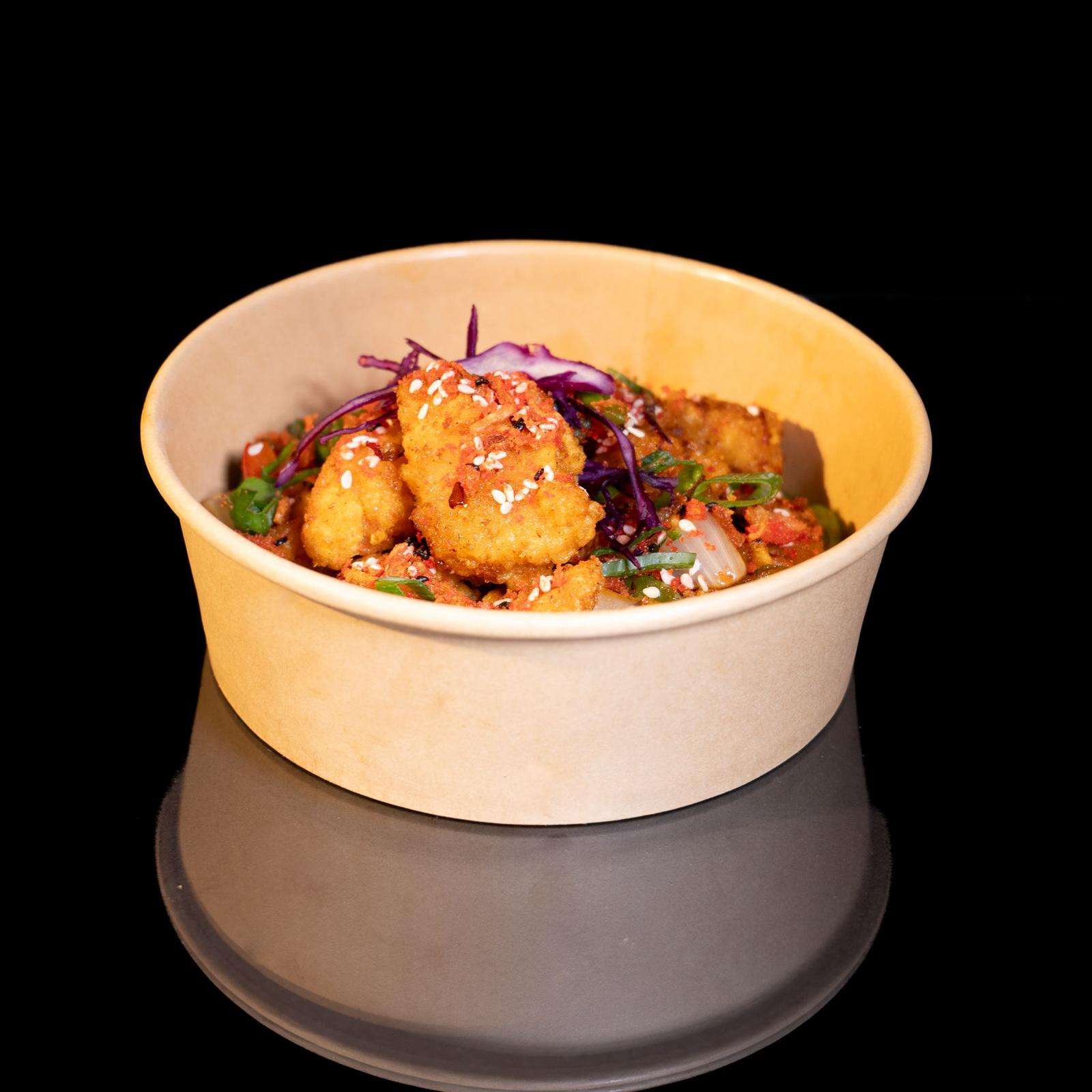 Chips topped with Korean fried chicken, spicy mayo, cheese, spring onions, and green chillies – a flavour explosion!