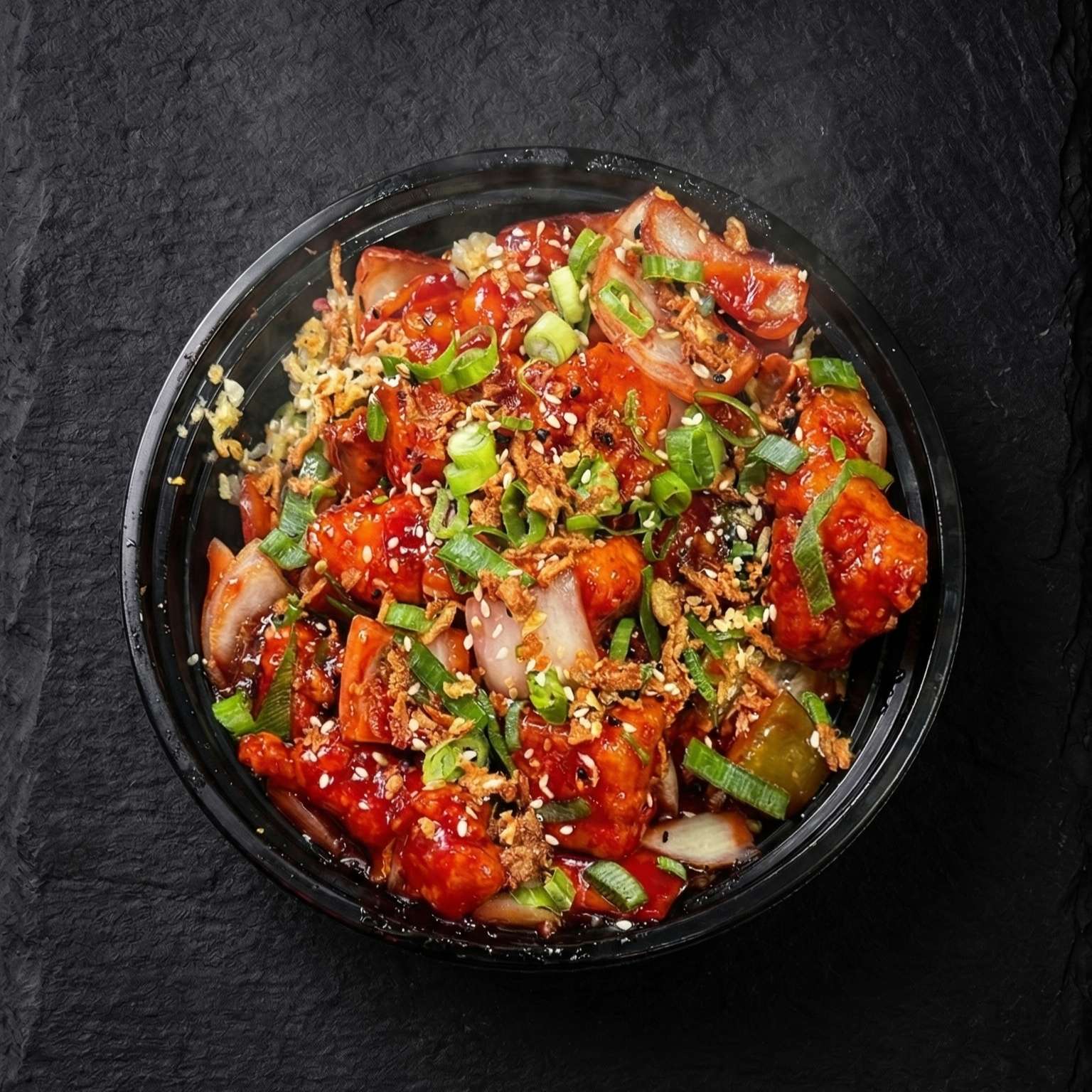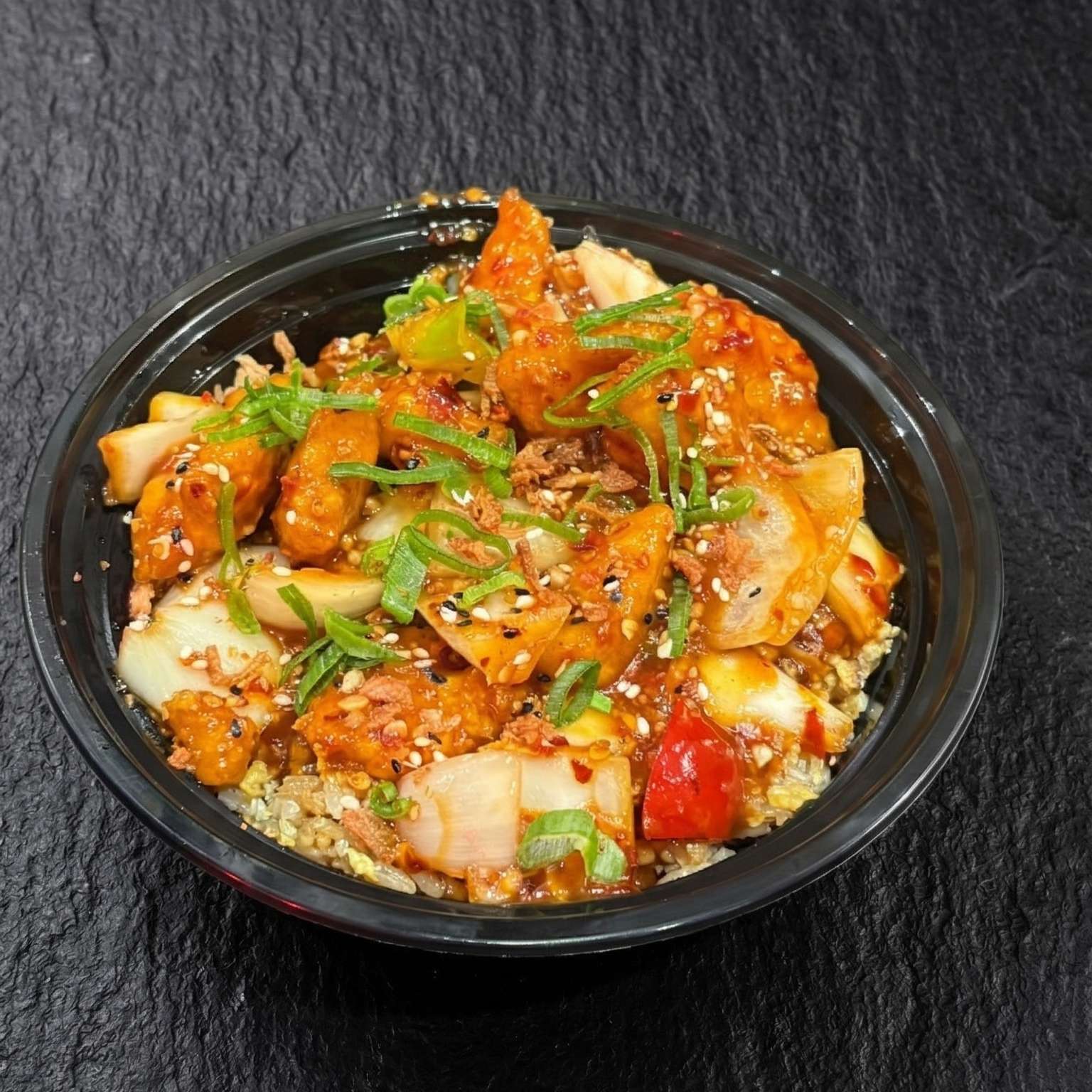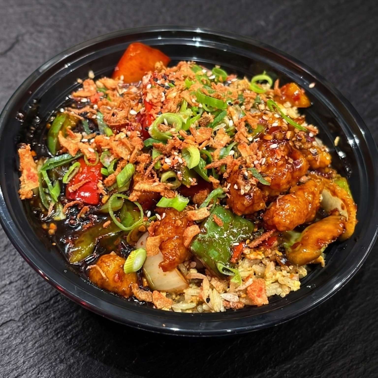 Diced peppers and onions in a spicy chilli chicken sauce- a bold choice for spice lovers