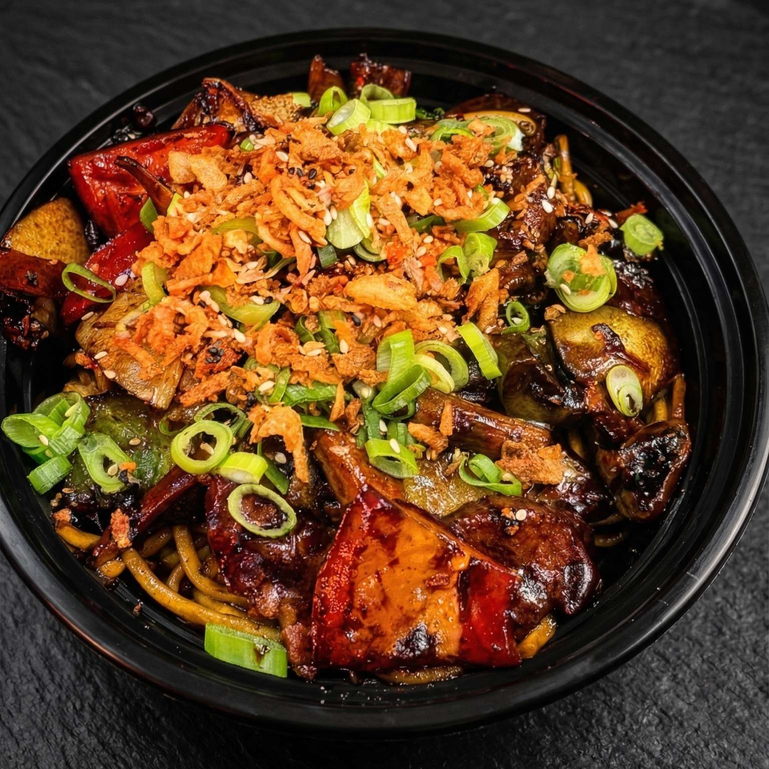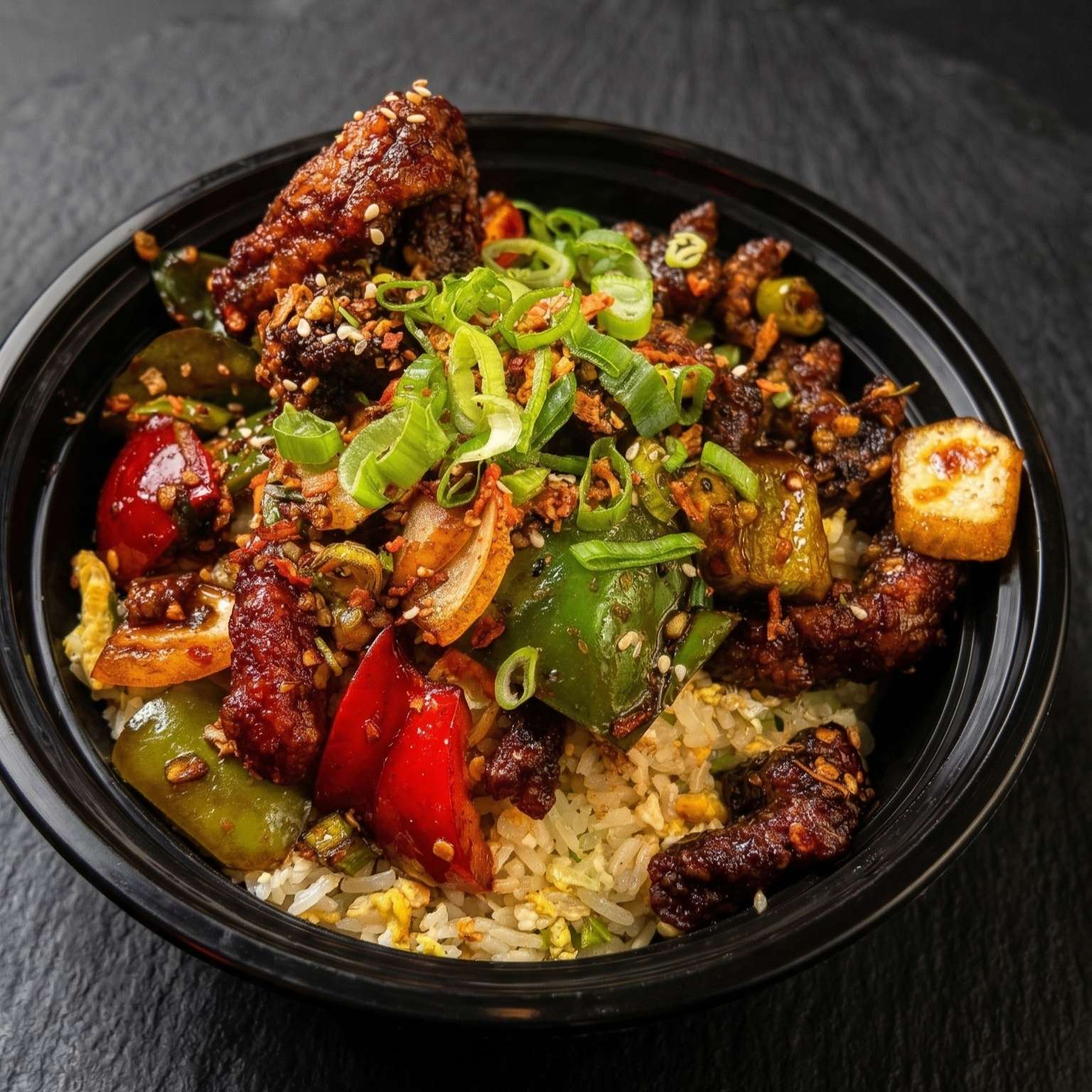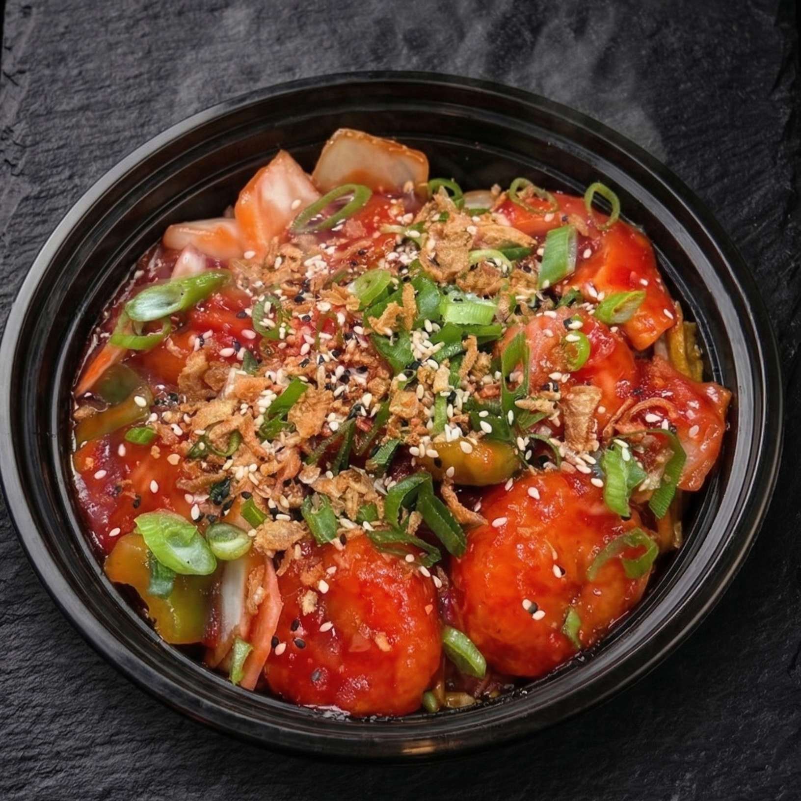 Diced peppers and onions in a spicy chilli chicken sauce- a bold choice for spice lovers