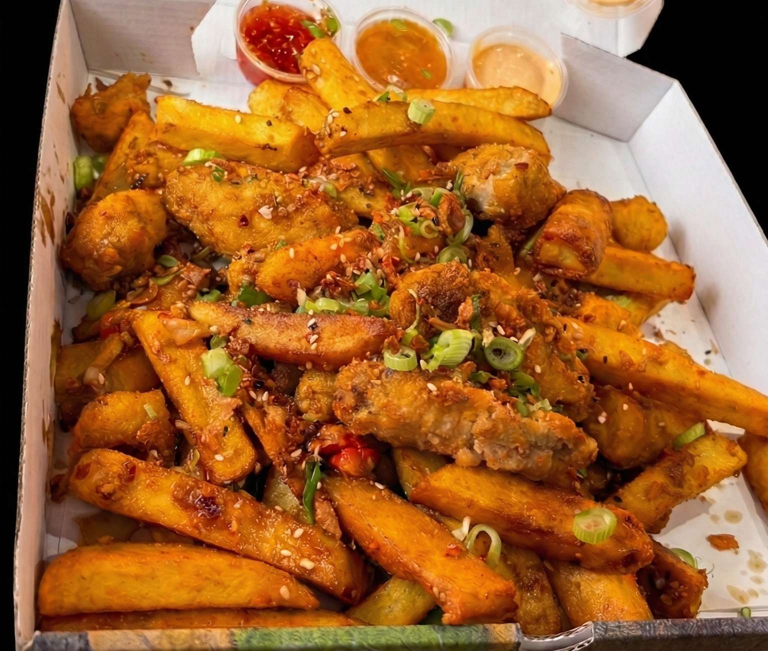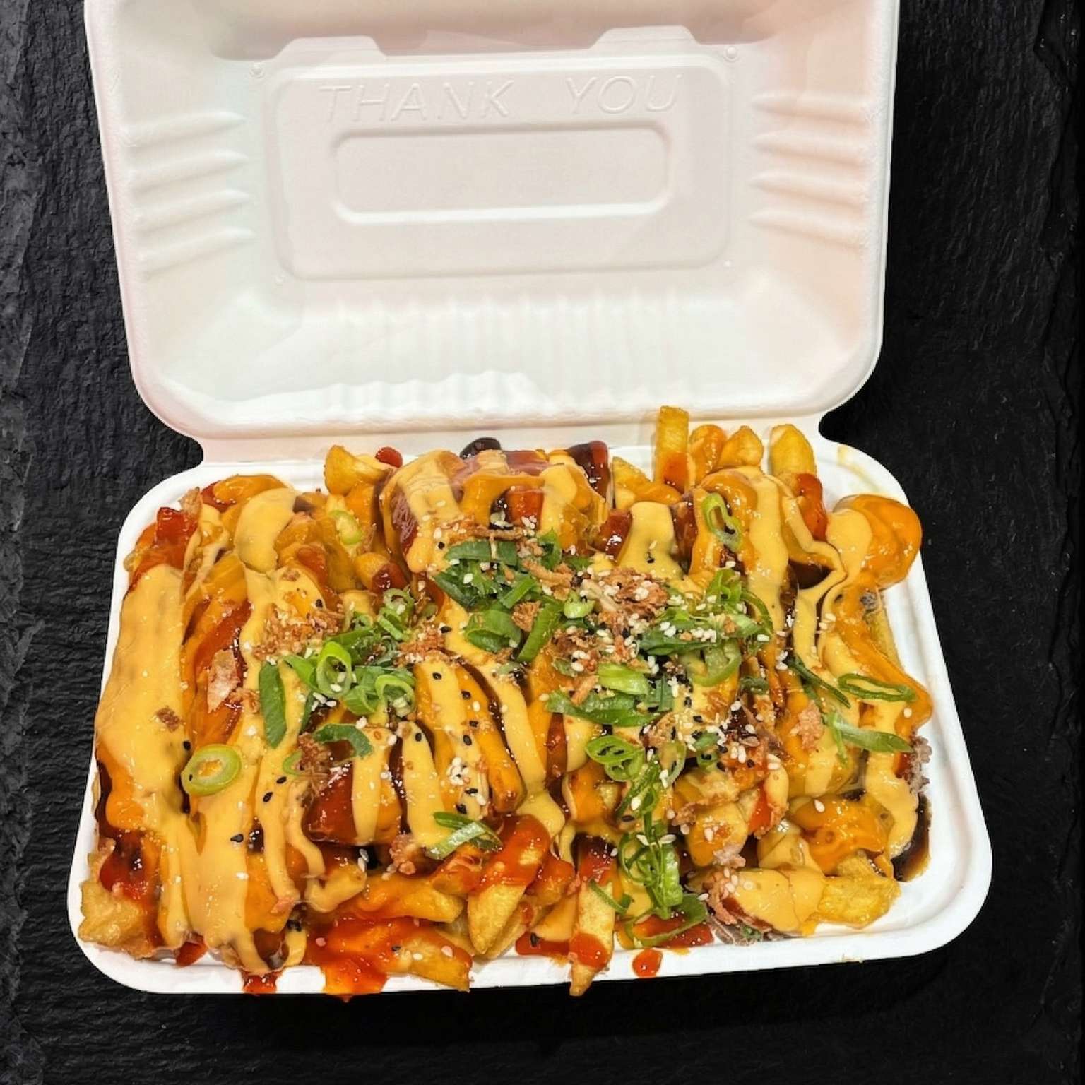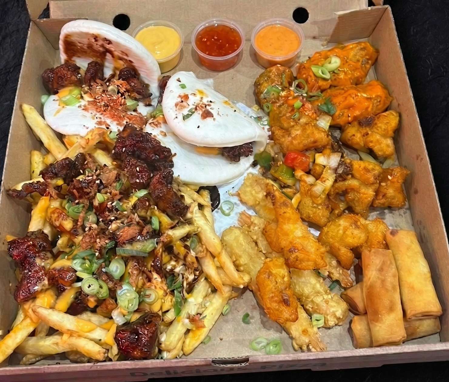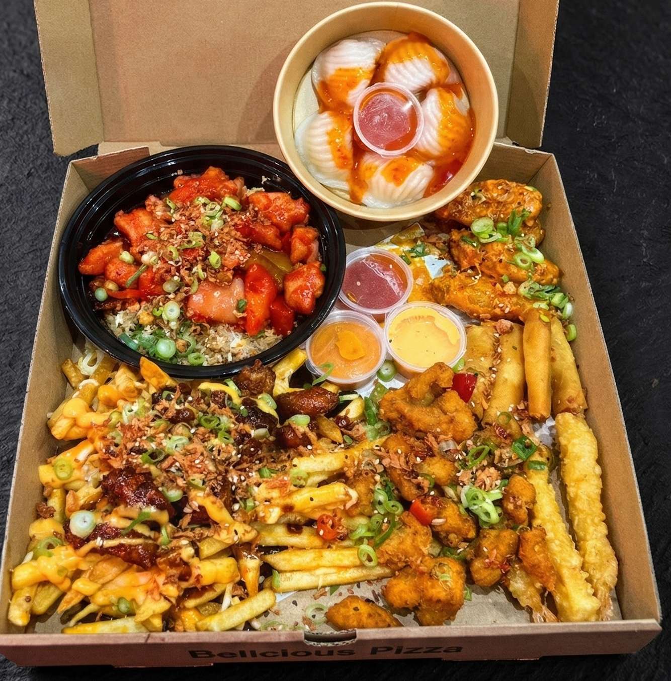 Salt and pepper chips, pulled beef, chicken, and tempura prawn with cheese, special sauce, spring onions, crispy onions, and sesame seeds – a must-try!