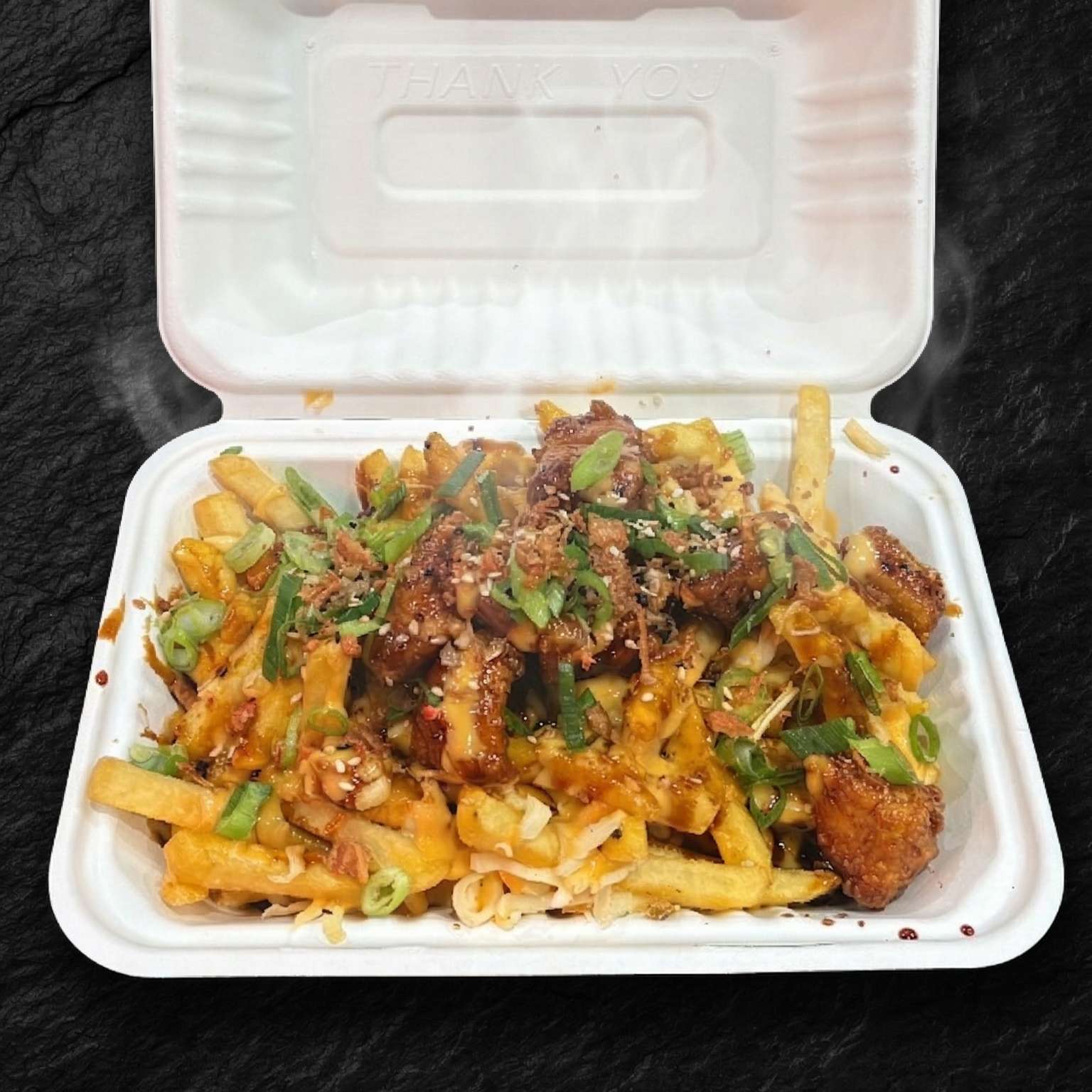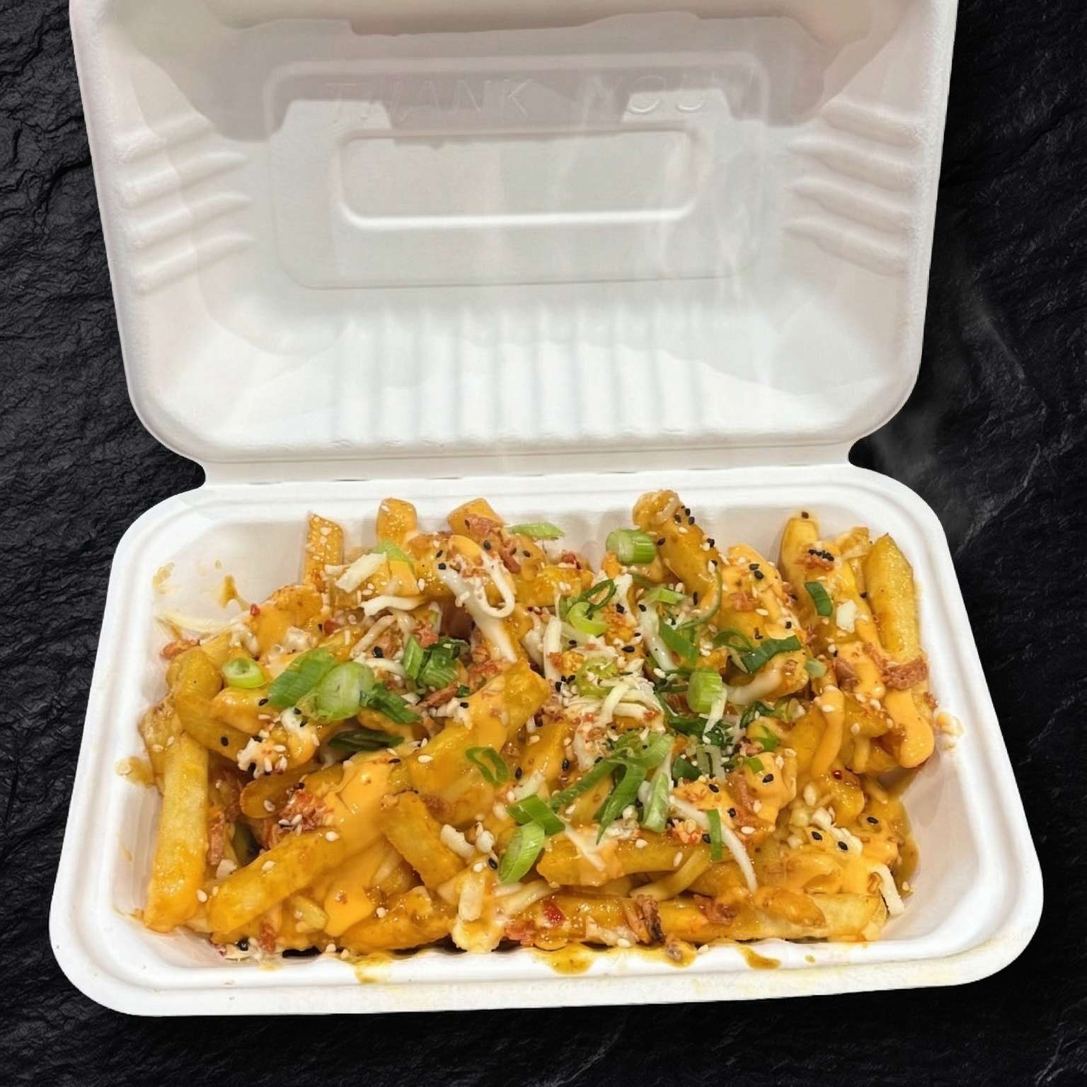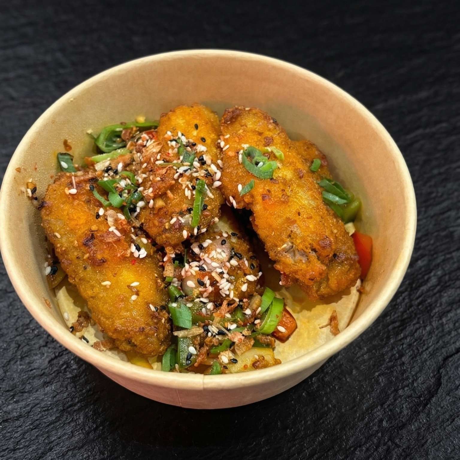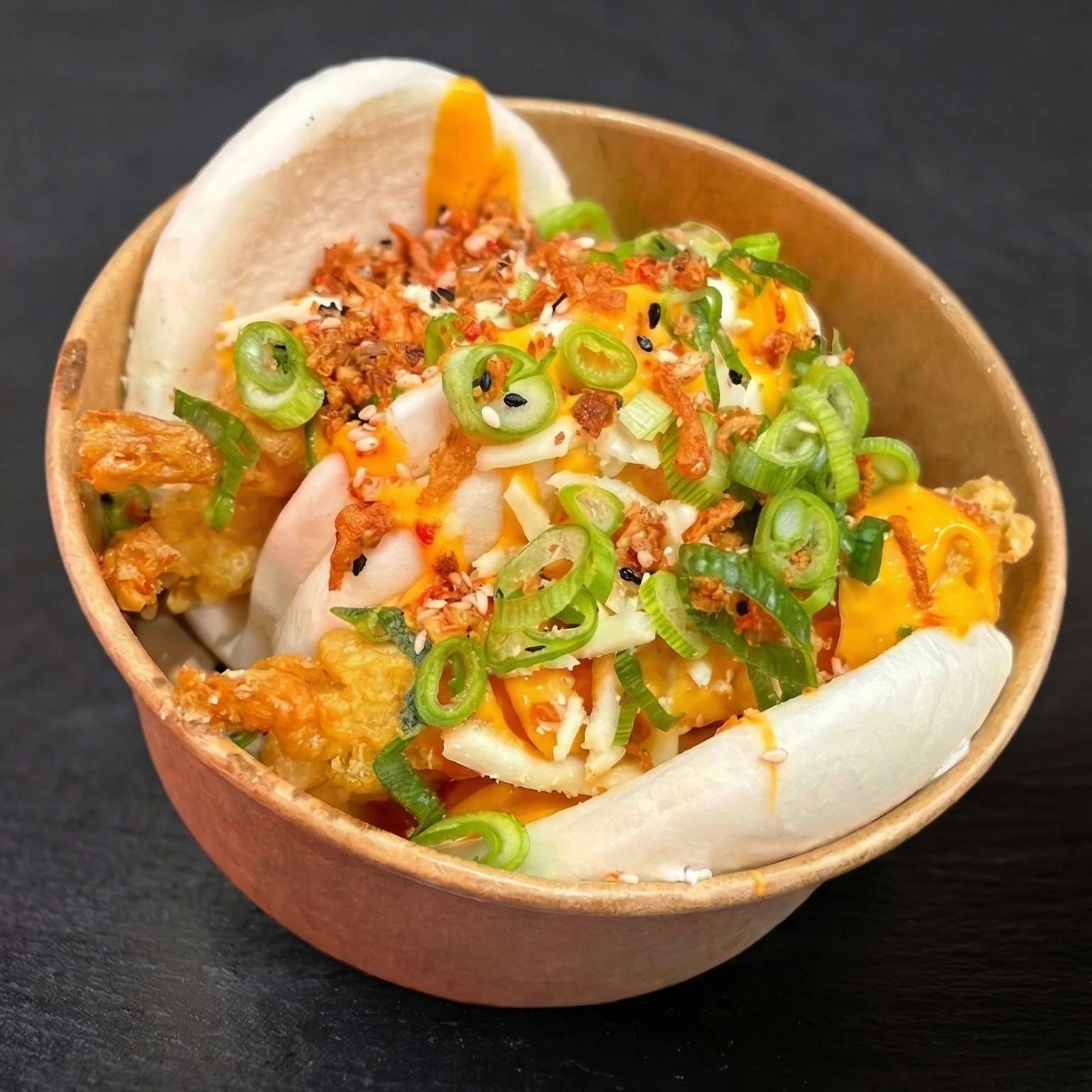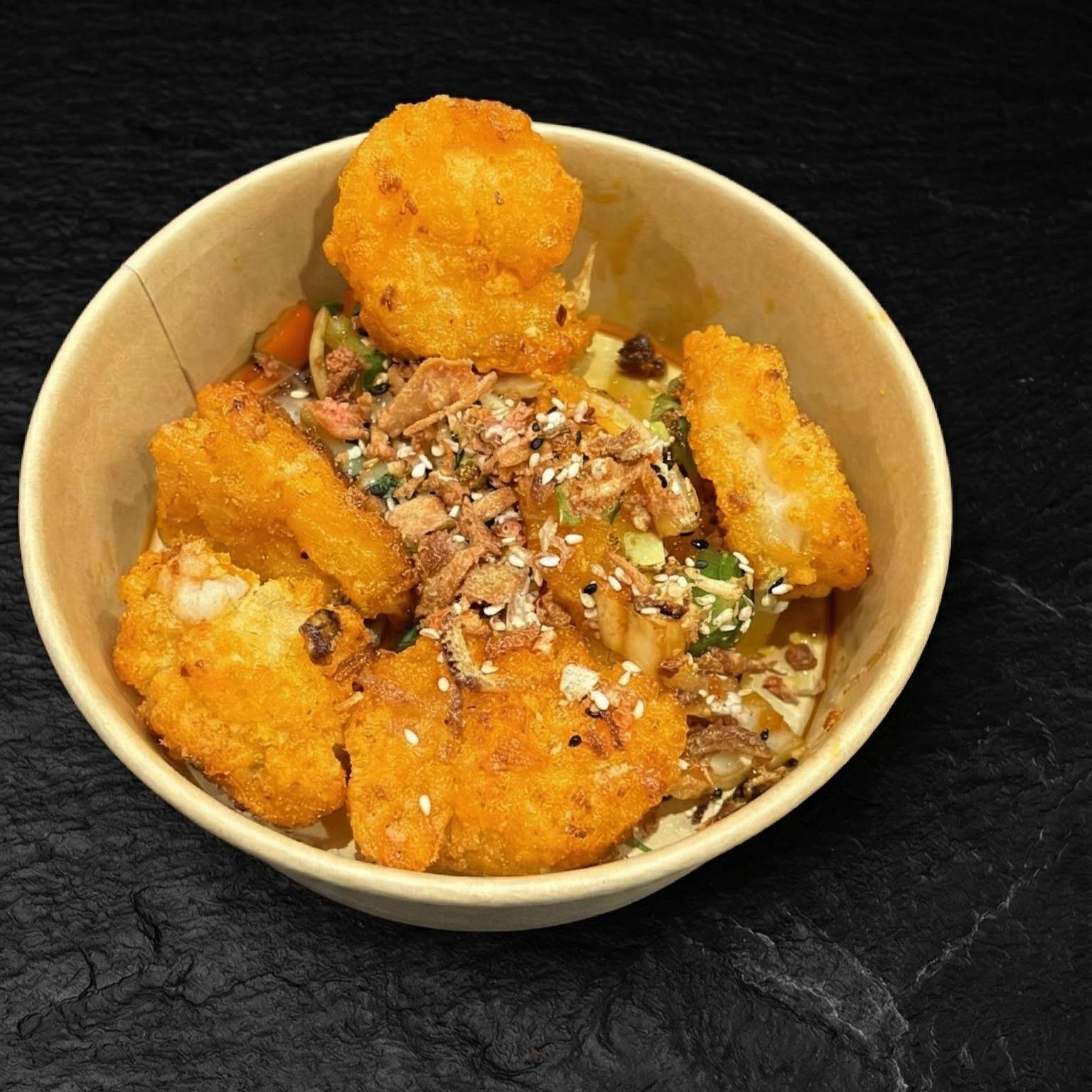 Salt and pepper chips, pulled beef, chicken, and tempura prawn with cheese, special sauce, spring onions, crispy onions, and sesame seeds – a must-try!
