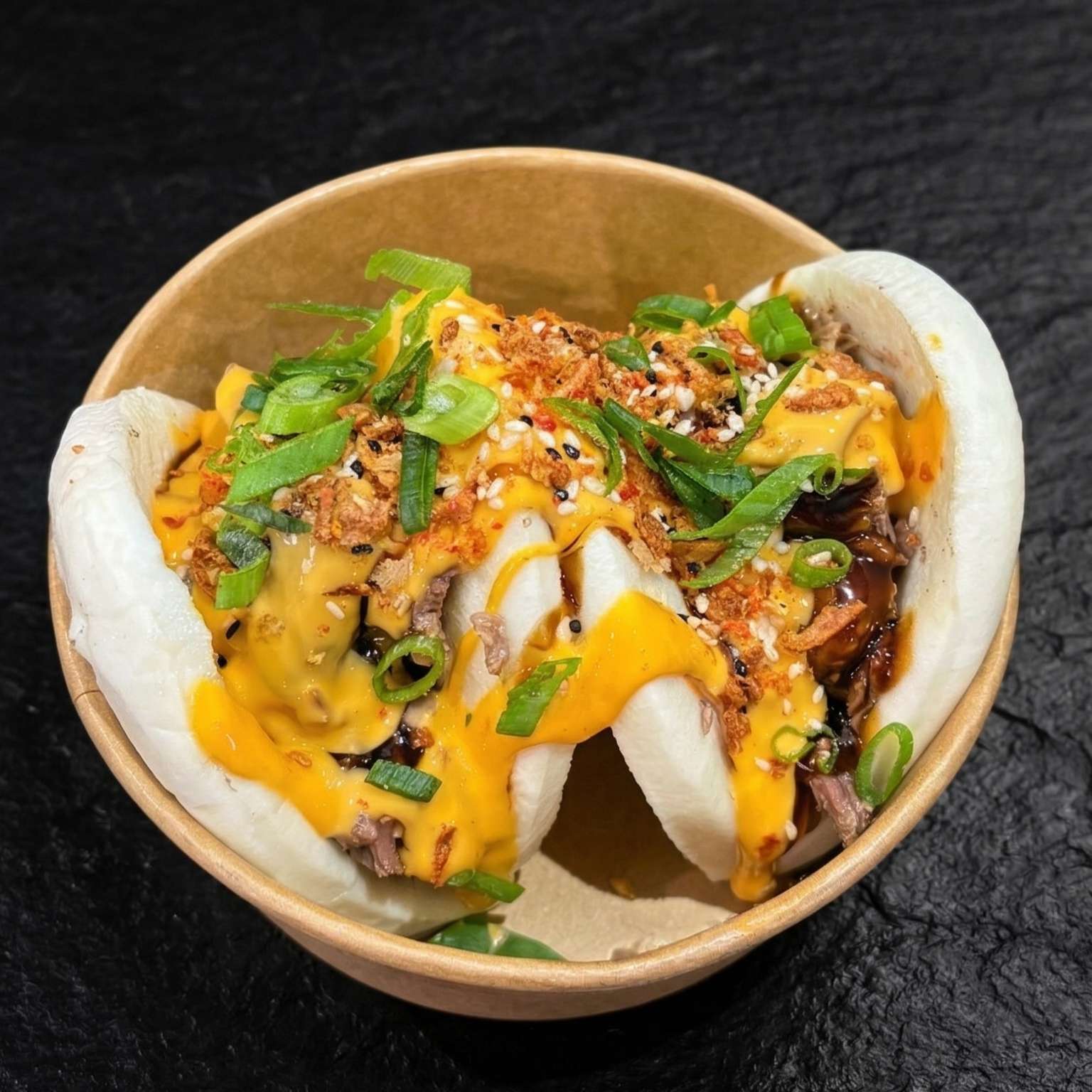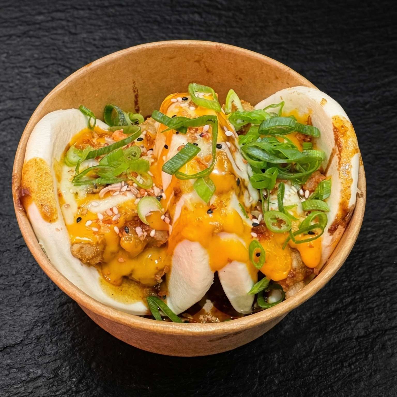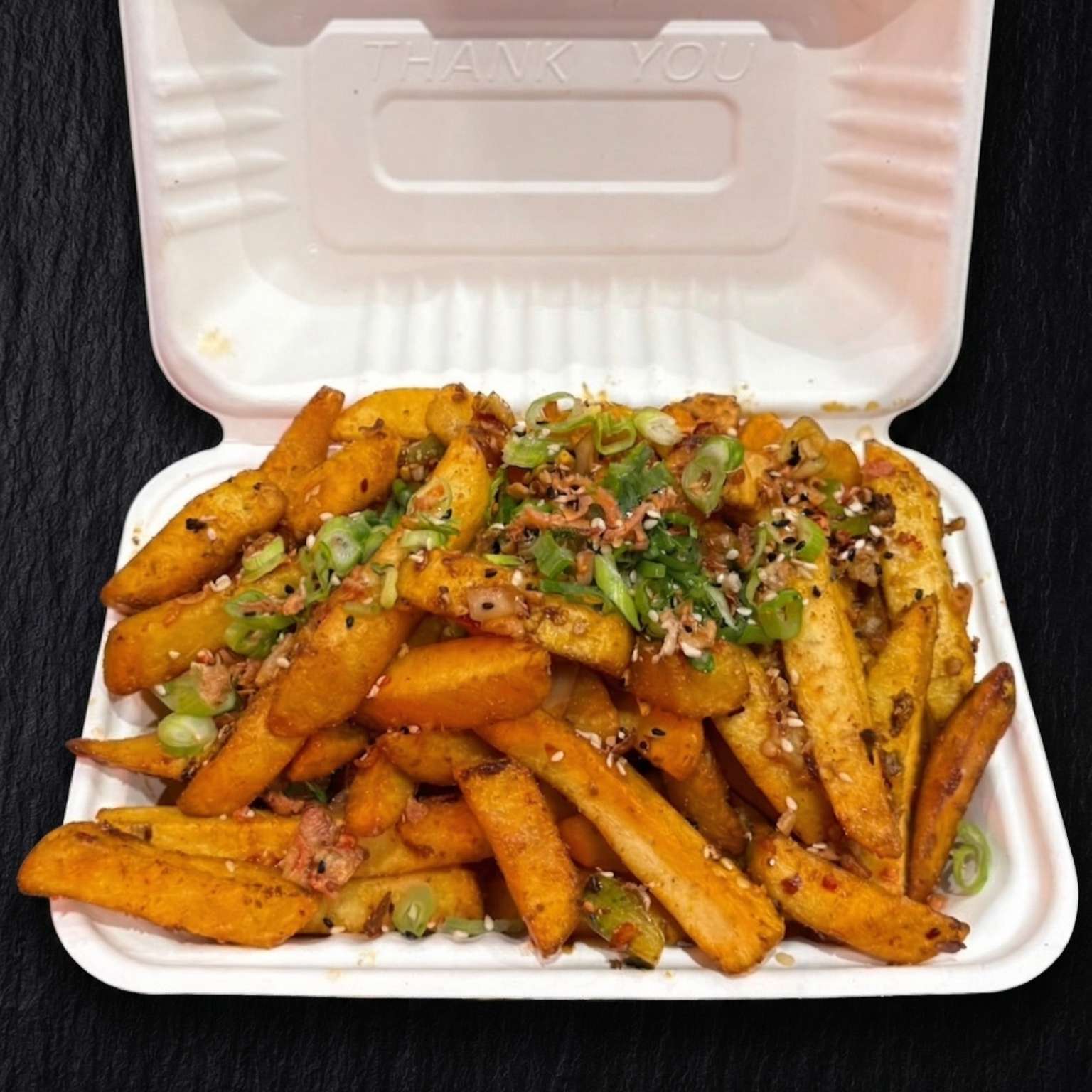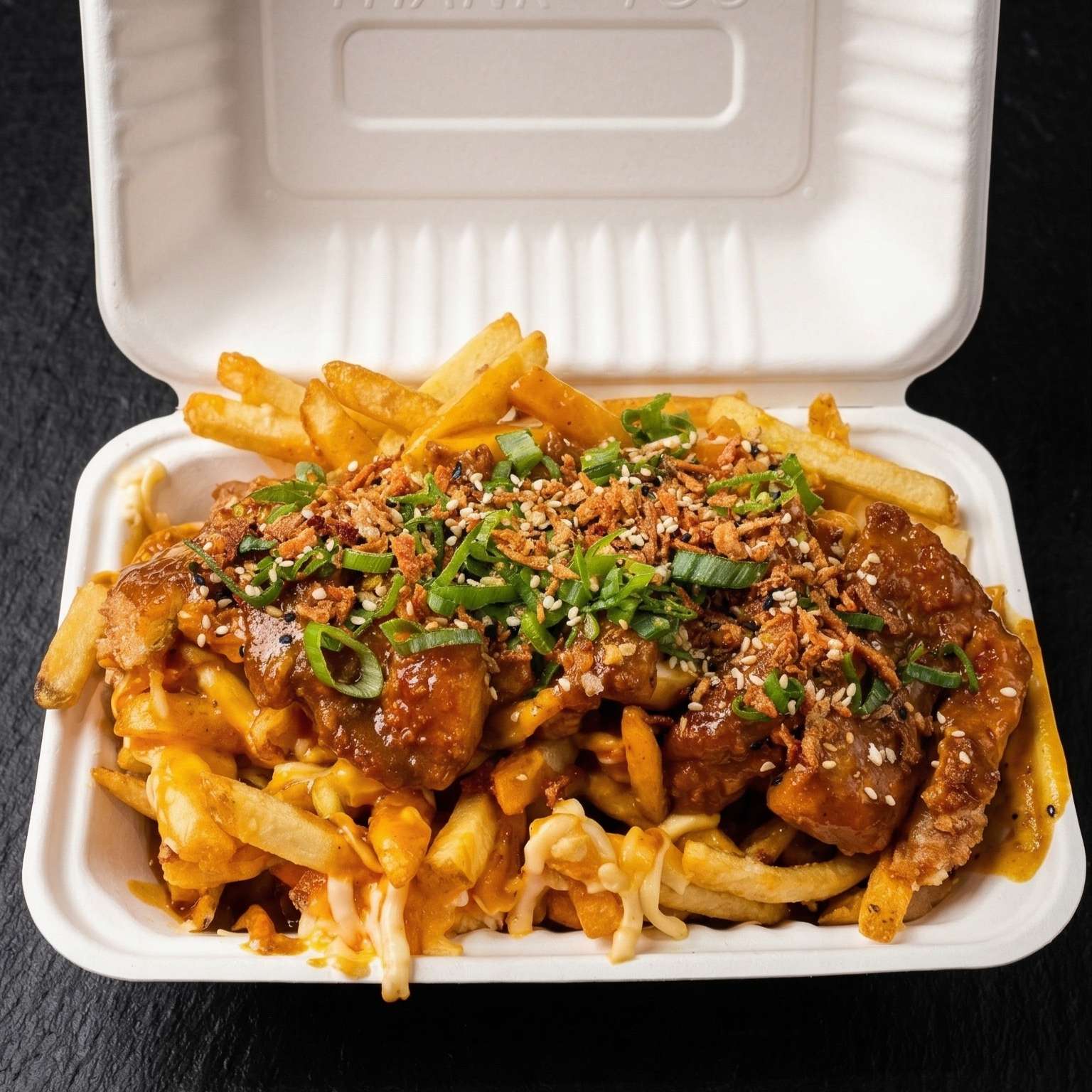 Salt and pepper chips, pulled beef, chicken, and tempura prawn with cheese, special sauce, spring onions, crispy onions, and sesame seeds – a must-try!