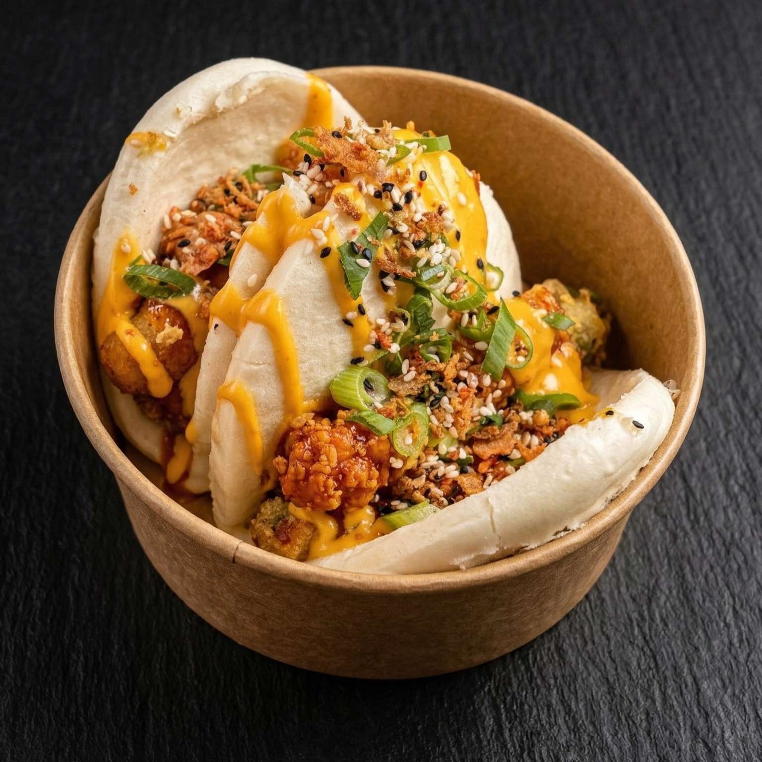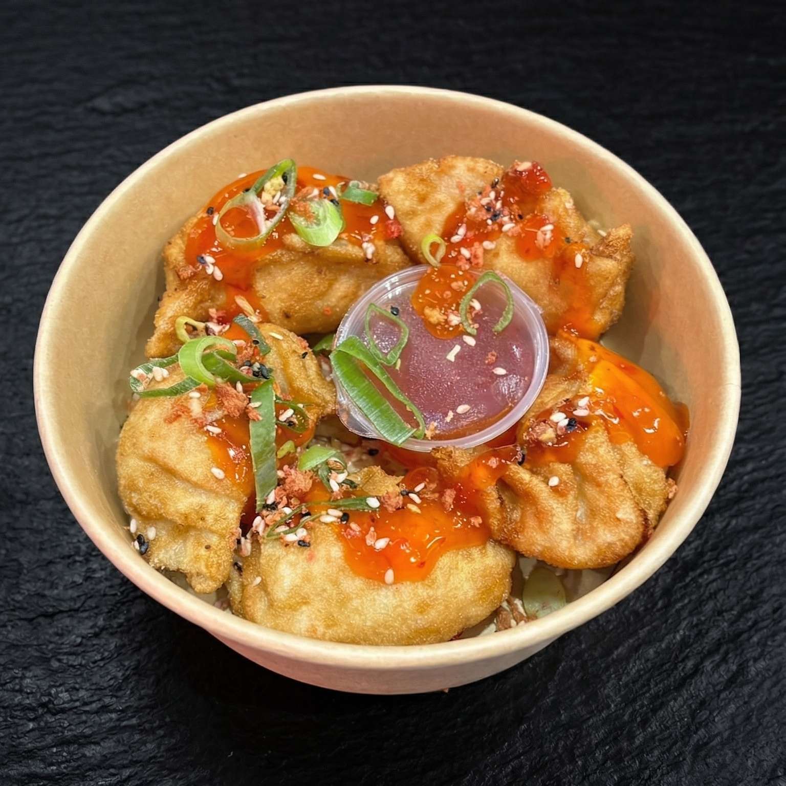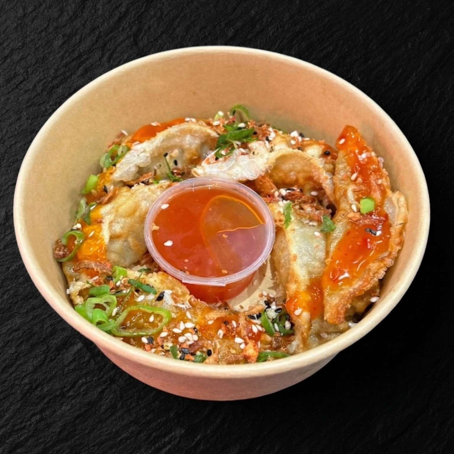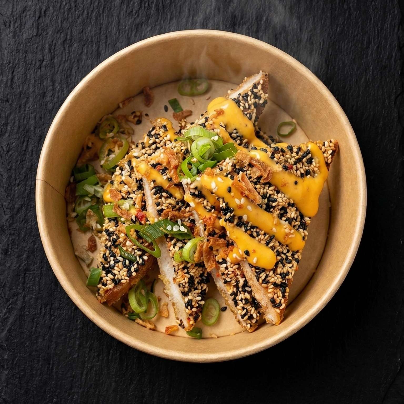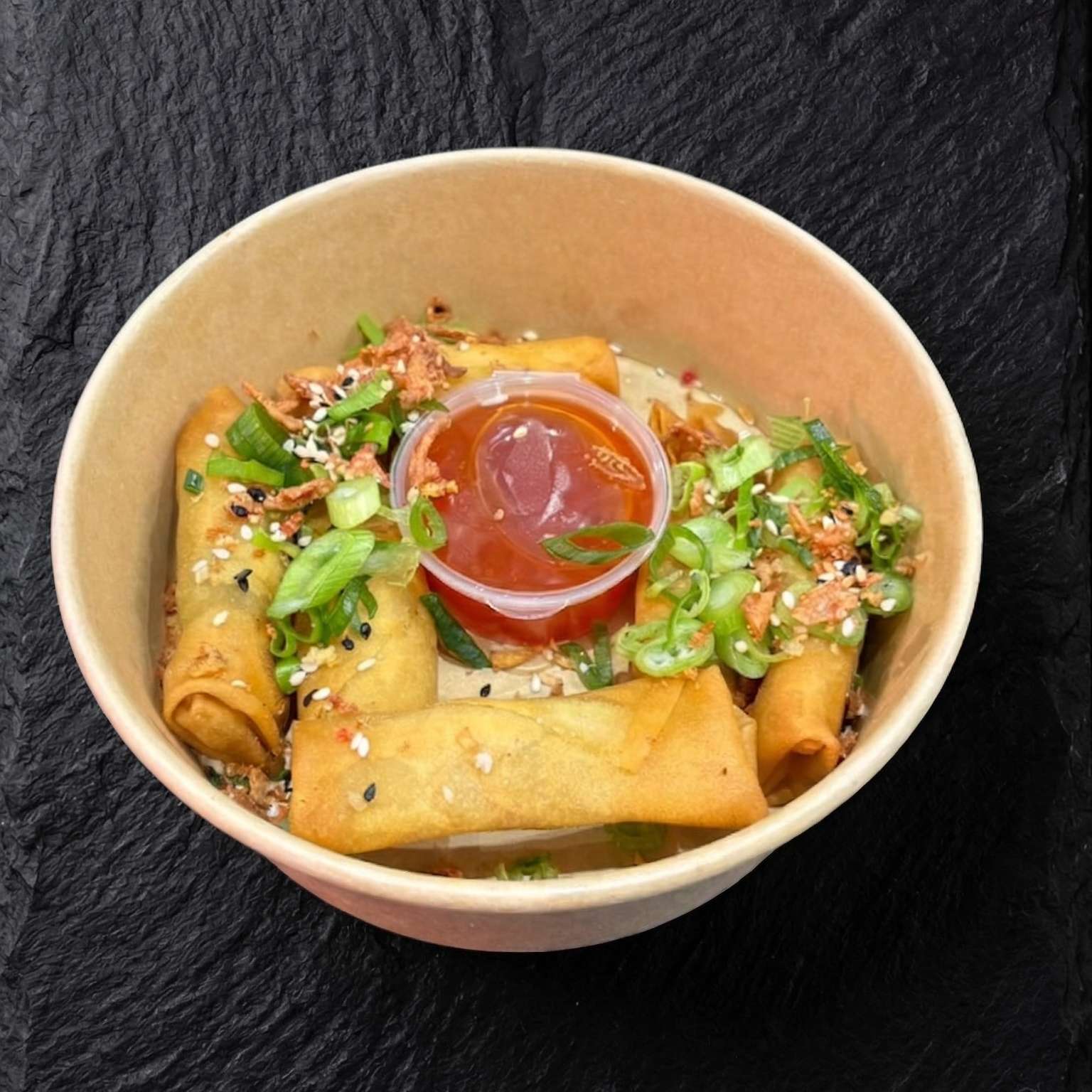 Salt and pepper chips, pulled beef, chicken, and tempura prawn with cheese, special sauce, spring onions, crispy onions, and sesame seeds – a must-try!