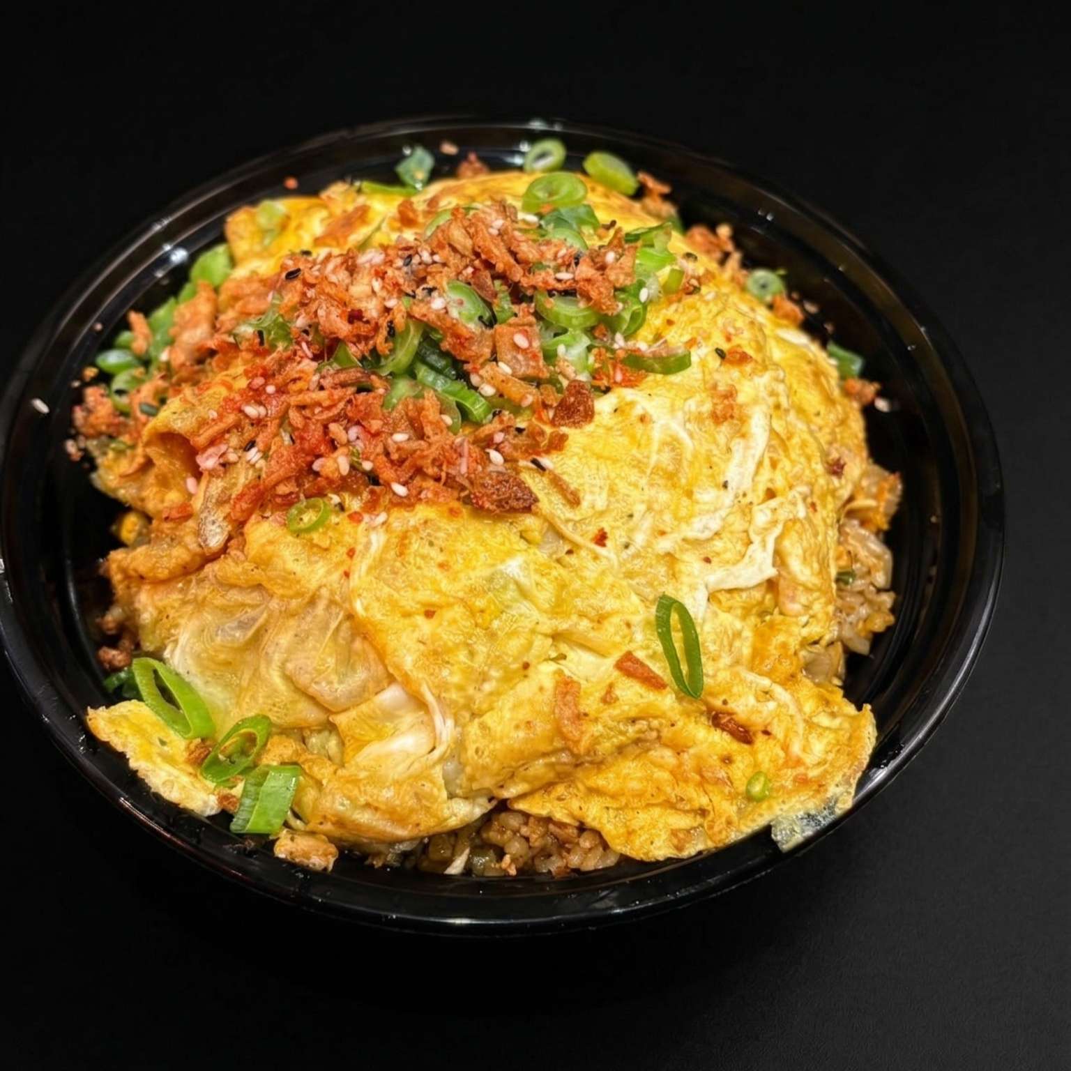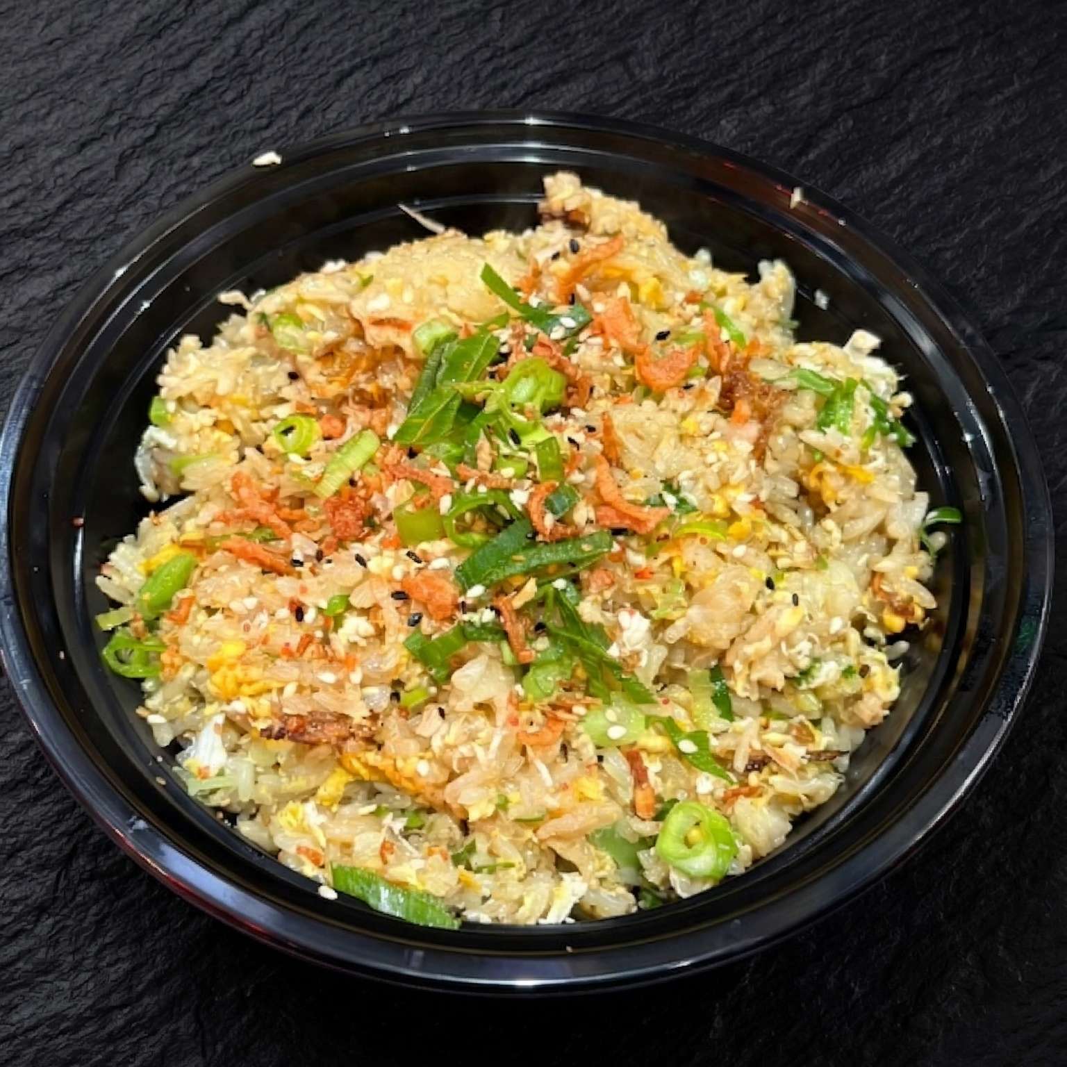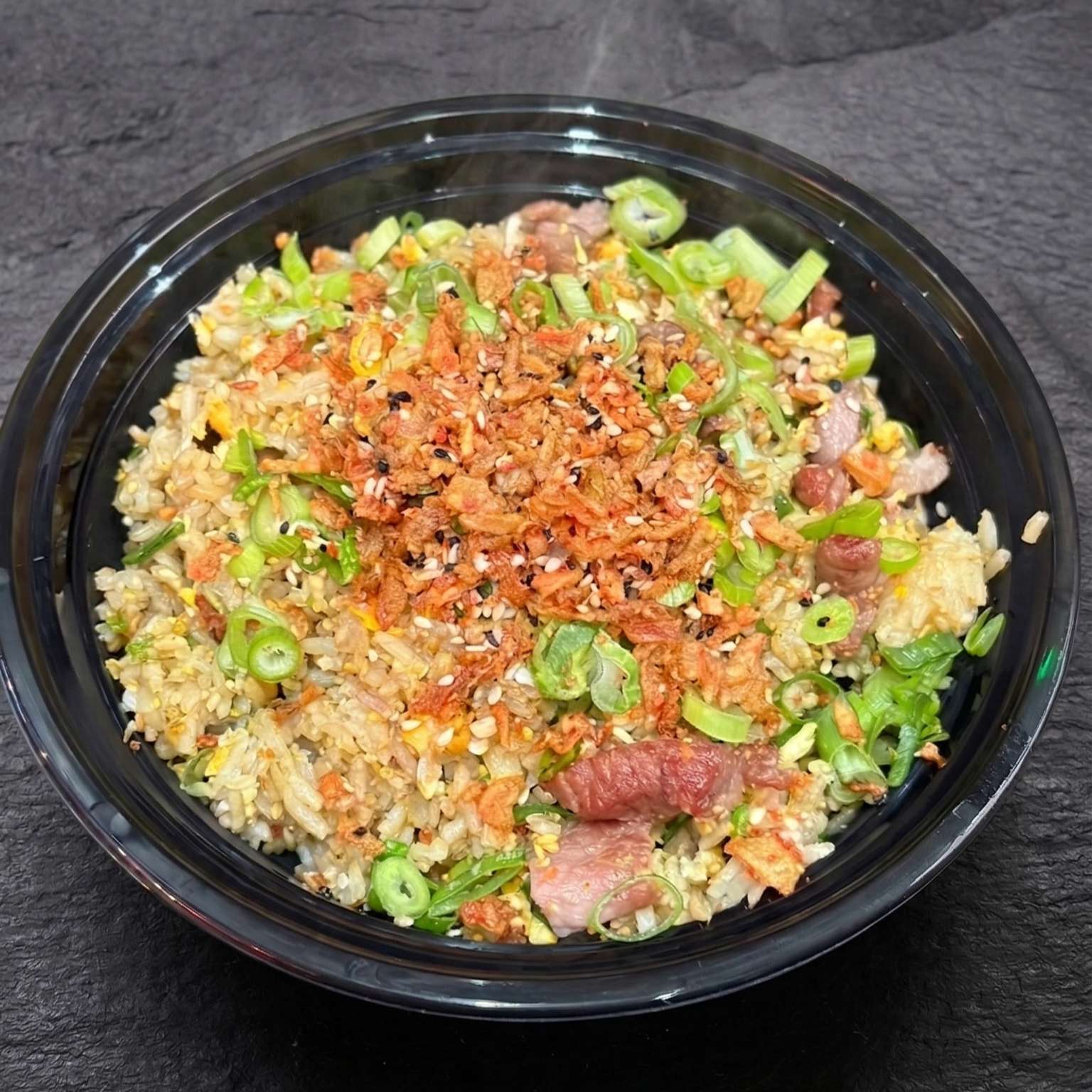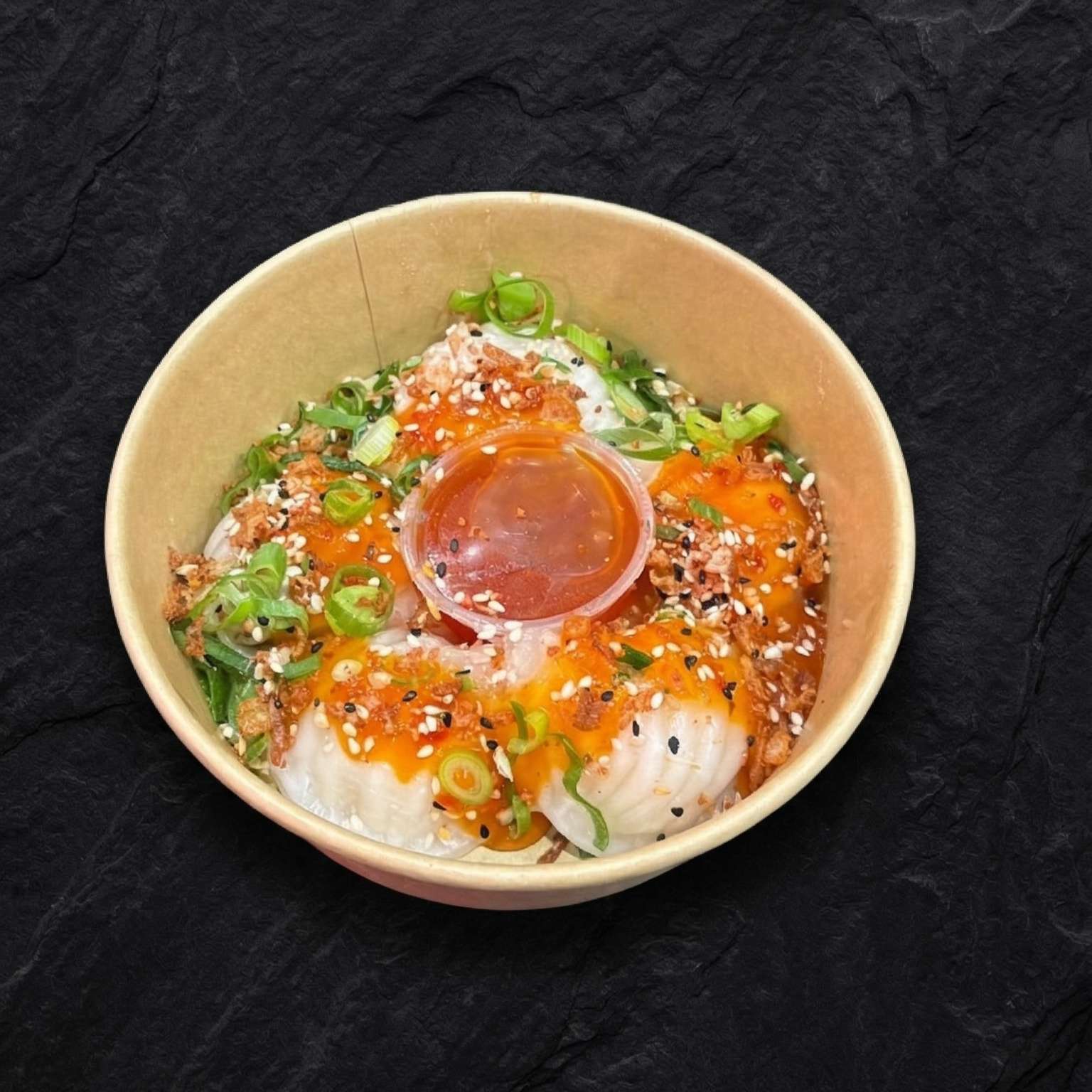 Salt and pepper chips, pulled beef, chicken, and tempura prawn with cheese, special sauce, spring onions, crispy onions, and sesame seeds – a must-try!