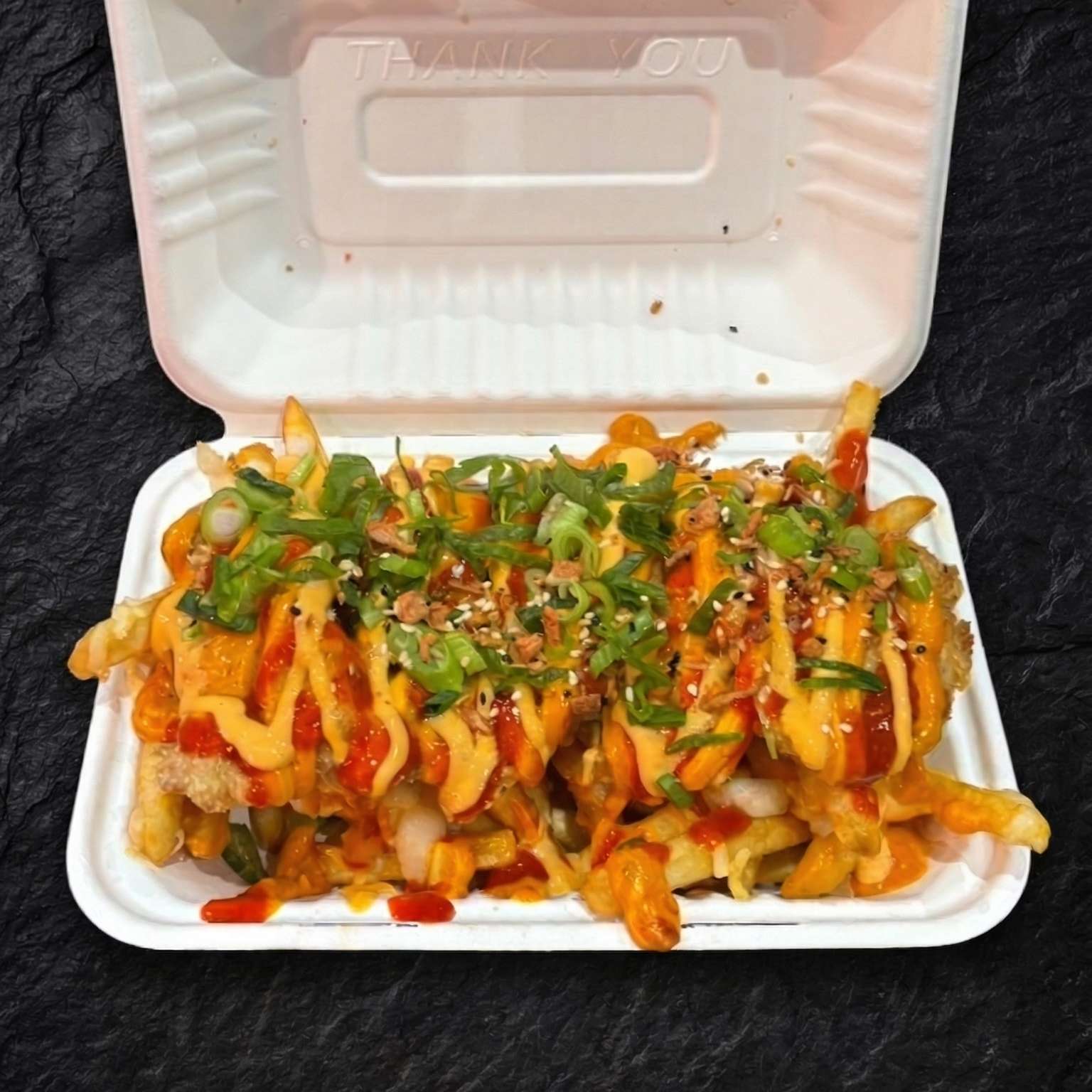 Salt and pepper chips with marinated chicken, cheese, sriracha mayo, red chillies, spring onions, and sesame seeds