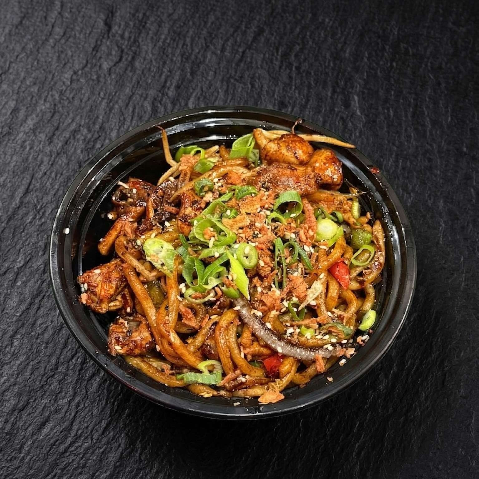 Thick udon noodles with chicken and prawn in a soy, oyster, and sesame oil sauce